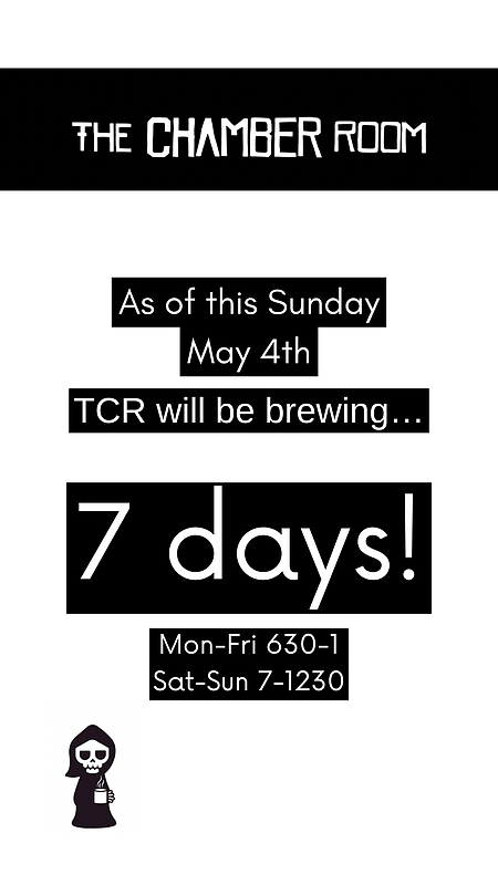 Thats right fam! As of this Sunday May 4th, TCR will be brewing 7 days...